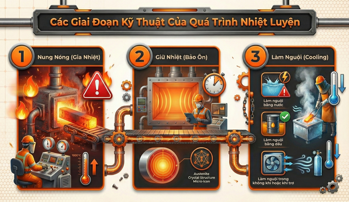 Bất kể phương pháp nào (tôi, ram, hay ủ), một chu kỳ xử lý nhiệt hoàn chỉnh bắt buộc phải trải qua ba bước kỹ thuật. Nếu làm sai hoặc làm ẩu một trong các giai đoạn này, sản phẩm chắc chắn sẽ bị lỗi như cong vênh, nứt ngầm, hoặc bề mặt bị thoát cacbon (mất độ cứng).